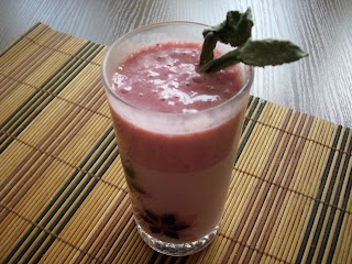 Na zdjęciu przygotowany rano koktajl bananowo truskawkowy z mlekiem sojowym naturalnym i cynamonem. Listek użyty do dekoracji to mięta z mamy ogrodu trochę już podsuszona.